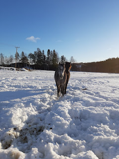 Idag var det isgata men harvat ridbanan och grusat. Blev ändå lugna saker vi övade på. Mer sideways, Pelle går lugnare nu och jag kan lägga in stick samtidigt som friendly game, backa med stick när vi går tillsammans (stick to me) Pelle stannar när jag stannar och när jag slår sticken försiktigt i marken backar han. Vi övade på yoyo game, backa på fingret och det svarade han bra på. Gav han tid och gjorde lång fas 1 och snabb 2, 3 och 4. Lite circling game i skritt och backa från nosrygg med hjälp av tryck. =) Blev en basic dag helt enkelt.